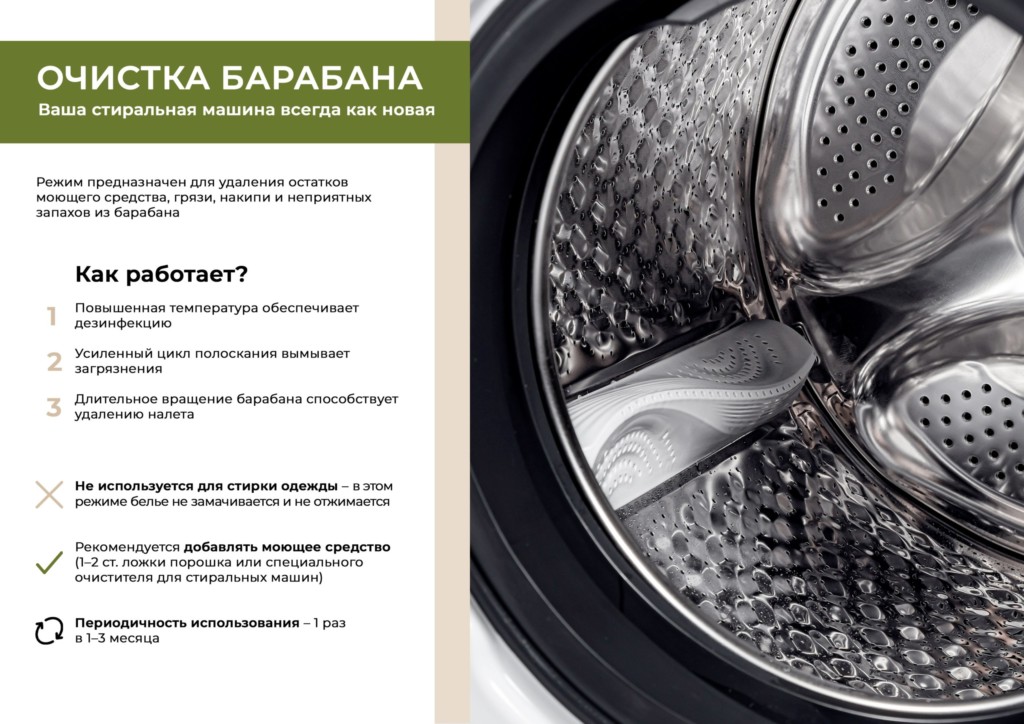 Очистка барабана — режим для поддержания чистоты и гигиены внутри машины. Программа запускает цикл очистки и стерилизации барабана при максимальной температуре с использованием большого количества воды, что эффективно удаляет загрязнения и предотвращает появление неприятных запахов.