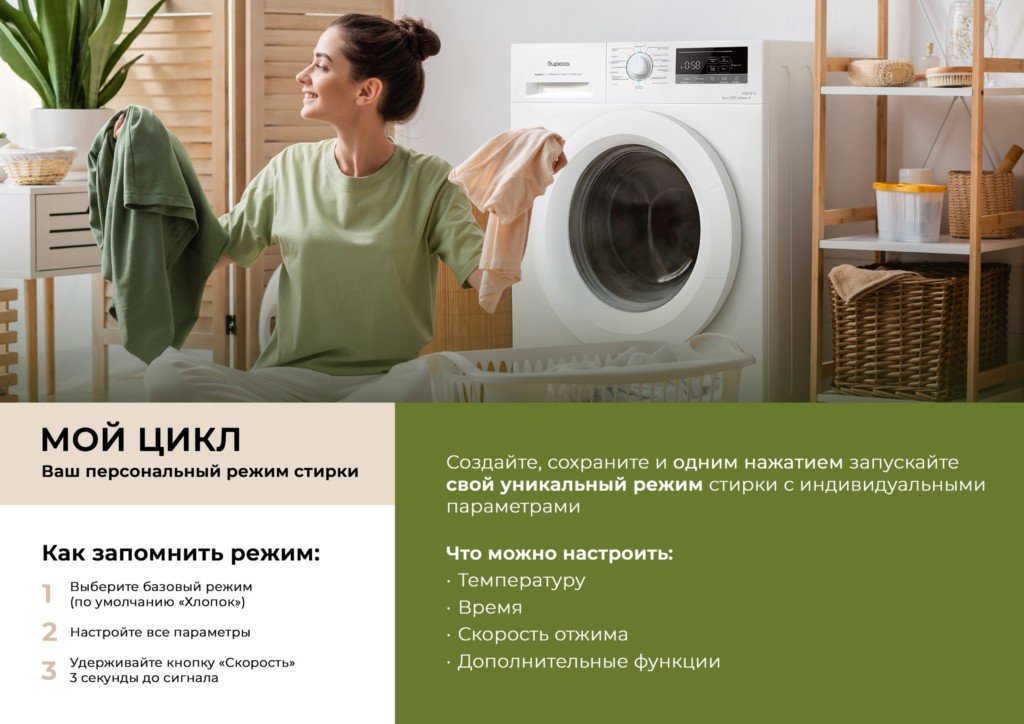 Мой цикл — позволяет создать и сохранить индивидуальный режим стирки, полностью соответствующий вашим предпочтениям. Вы можете самостоятельно настроить такие параметры, как температура воды, продолжительность стирки и скорость отжима.